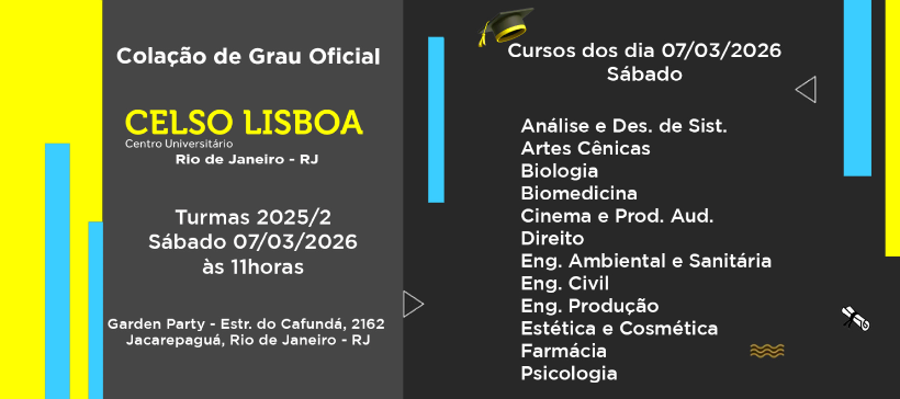 Colação de Grau Oficial Celso Lisboa dia 07 de Março - Sábado às 11h